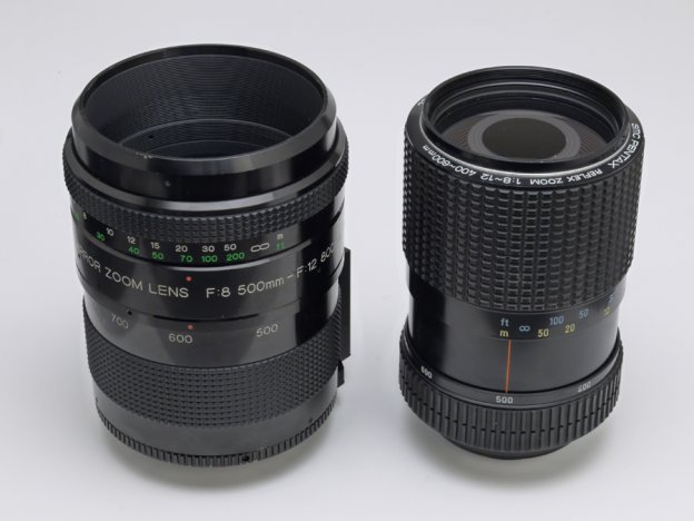 私が知る限り、レフレックス式ズームレンズはこの2本だけ。ズーム比は低いが、微妙なフレーミング調整に便利。ただし単焦点レンズに比べるとF値が暗くピント合わせが難しい。