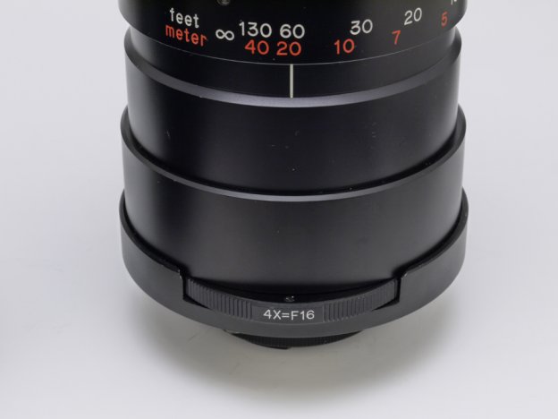 距離目盛りの前方にある銀色のノブがピントレバー。副鏡を前後させてピントを合わせるレフレックスレンズはとても珍しい。レバーから真っ直ぐ伸びた棒が副鏡に繋がっているので、視力検査に使うランドルフ環のようなボケが出る。このレンズは、ライカR用レンズとして供給されたことで有名。ミノルタはRF ROKKOR 1600mm F11にも同じ方式を採用している。